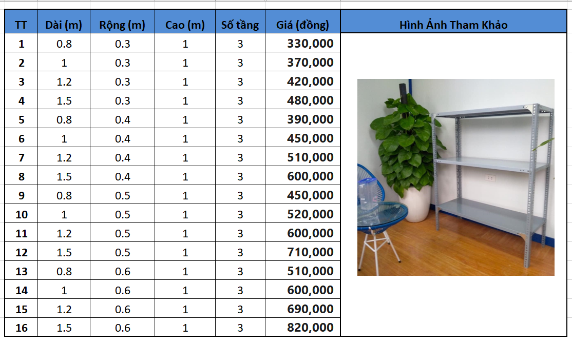 - Chi tiếc bảng giá kệ sắt v lỗ 3 tầng: