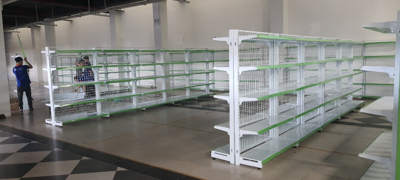 - Lưng kệ siêu thị là lưới ô vuông hoặc là tấm sàn tôn đục lỗ;