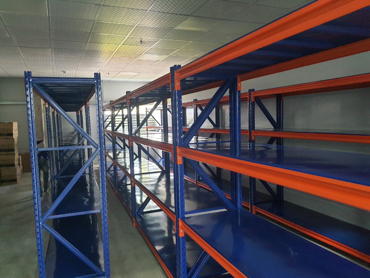 Tại đây, khách hàng đặt bộ kệ: Cao 2m, dài 2m, rộng 60cm, 4 tầng beam, khả năng chịu tải 300kg/tầng. Với mầu xanh và cam truyền thống.