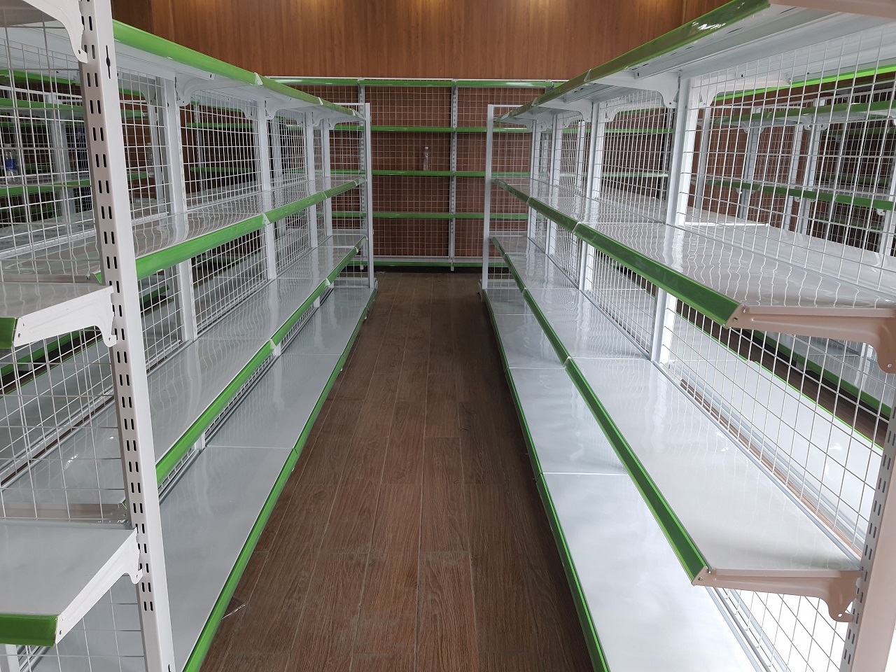 - Kệ siêu thị lưng lưới: là loại mà lưng được hàn dạng ô vông lưới sắt sơn tĩnh điện, đây là loại phổ biến nhất;