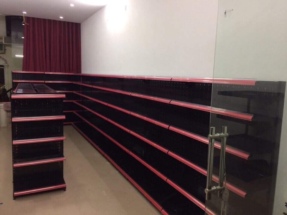 Kệ siêu thị màu đen, lưng tôn đục lỗ đắt nhưng đẹp và chắc chắn vô cùng, bày hàng hóa cũng vô cùng sang trọng, đẹp mắt.