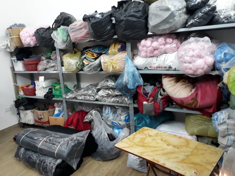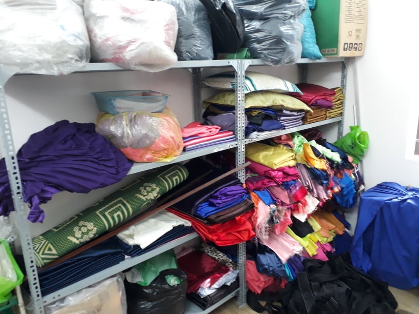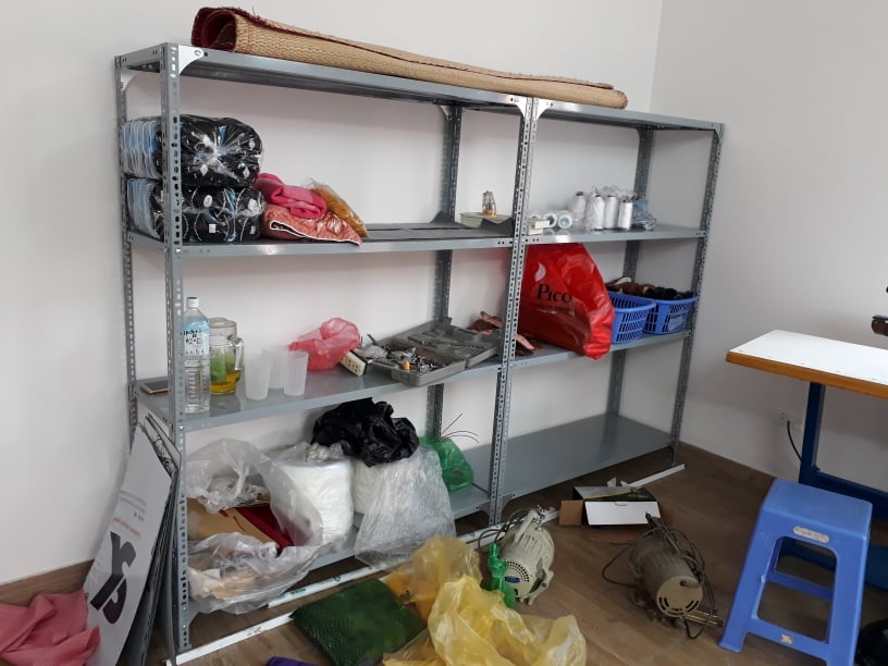 Kệ Sắt V lỗ Thanh Trì, lắp tại Cổ điểm, dùng để chứa các nguyên vật liệu phục vụ sản xuất cặp tóc, một sản phẩm làm đẹp cho phụ nữ.