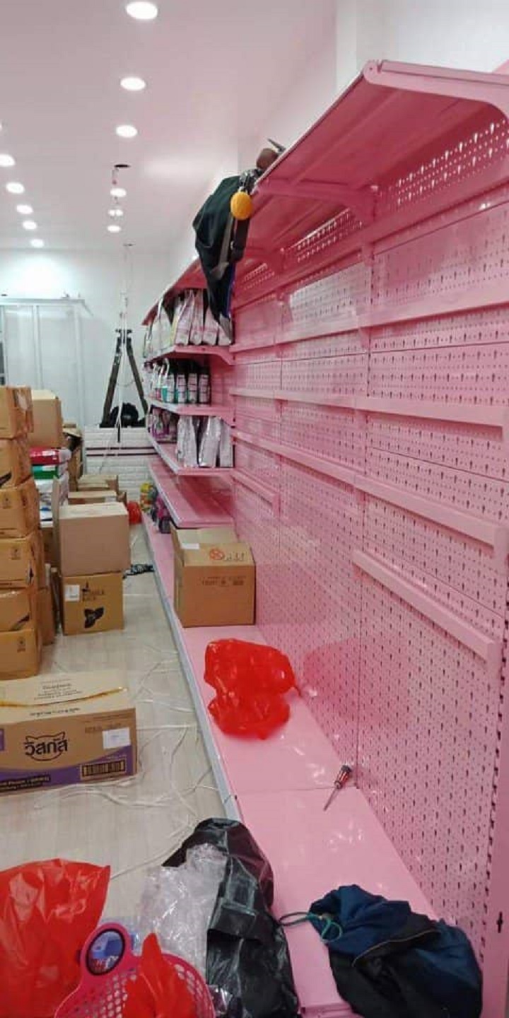 Kệ siêu thị mầu hồng thích hợp với không gian trẻ trung, sản phẩm thời trang, trẻ em....