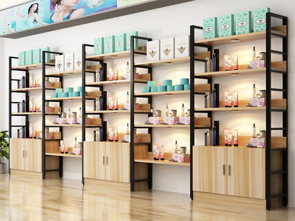 - Ngoài ra những chất liệu khác: Gỗ, sắt hộp... có thể kết hợp để sử dụng tạo ra các sản phẩm đẹp mắt cho kệ siêu thị mỹ phẩm.