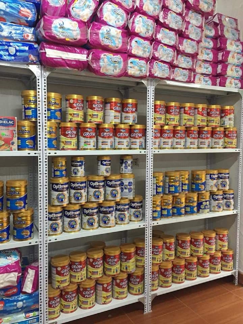 - Kệ Siêu thị sữa đa năng, là loại kệ sắt v lỗ nhưng mầu trắng, được lắp đặt chắc chắn và để trưng bày sữa, bỉm trong các cửa hàng chuyên về sữa bỉm...